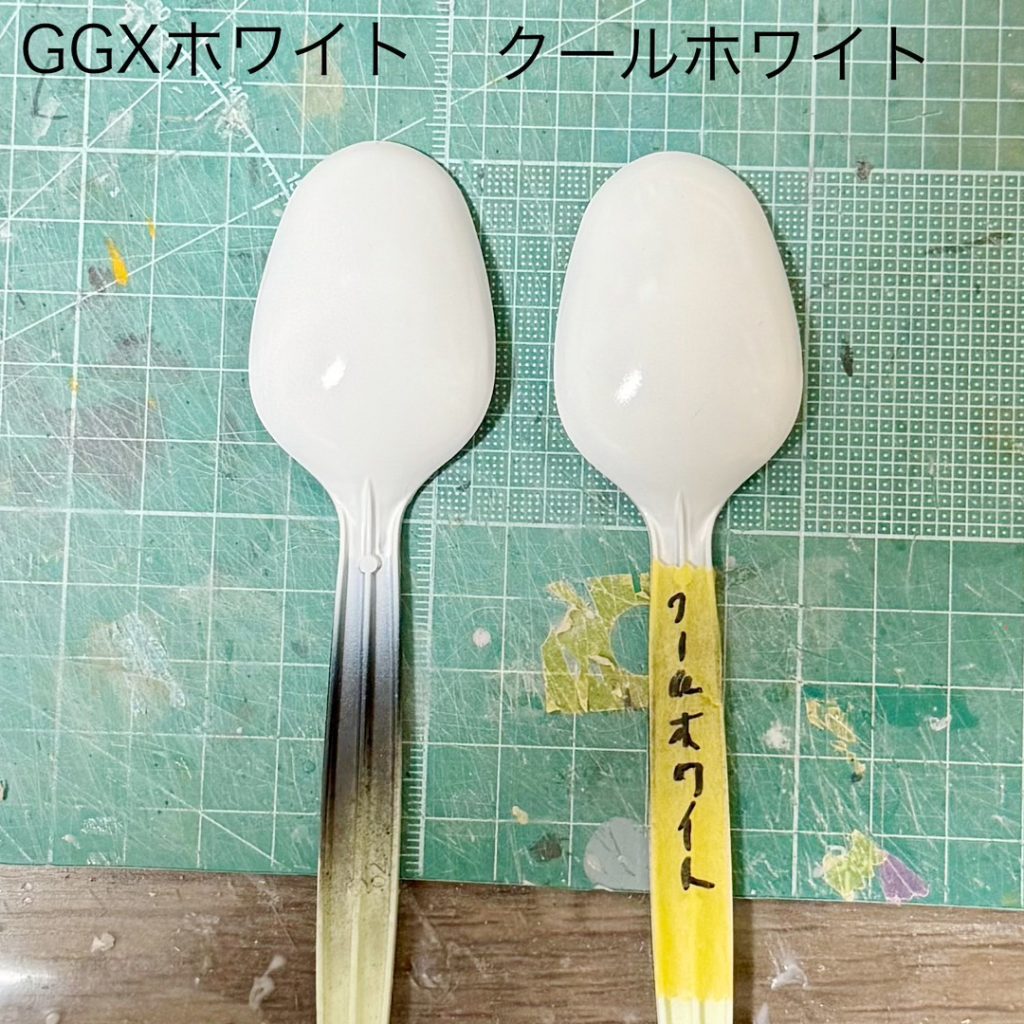 2007年に発売されたMr.カラーGXのクールホワイトと比較すると、乾燥に少し時間かかるが塗膜の平滑さはGGXホワイトの方が綺麗